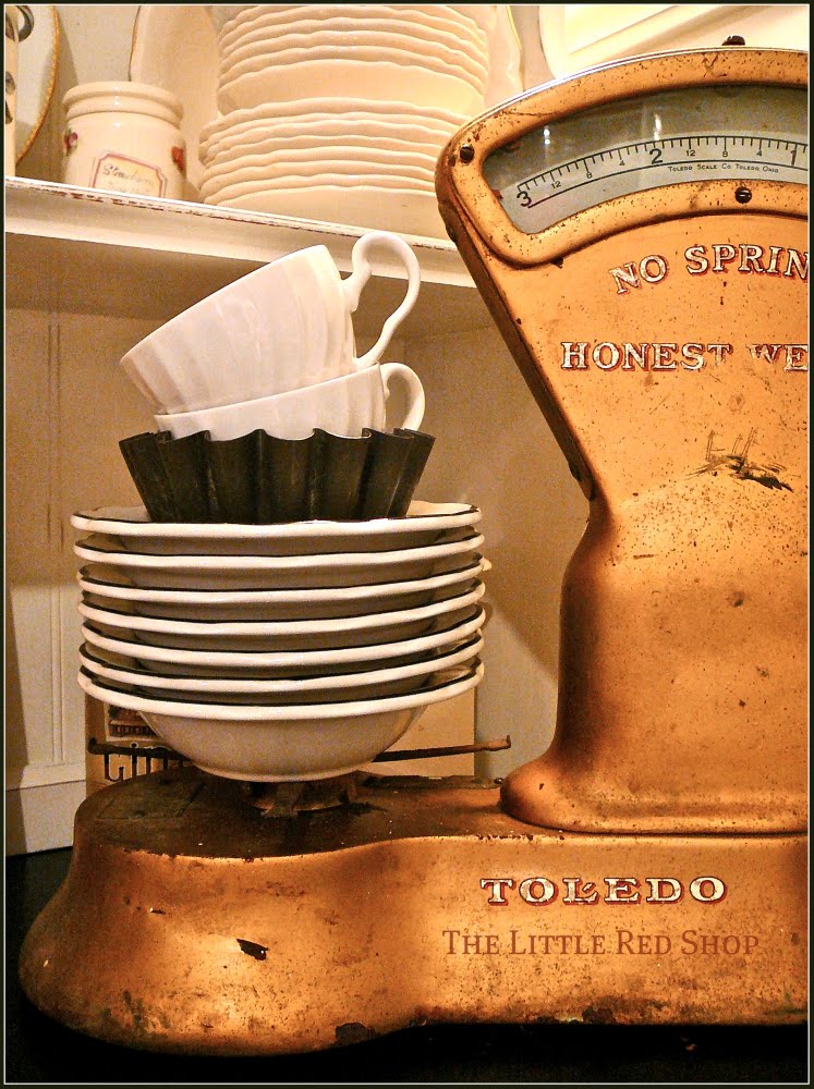 Are you ready for this? The Toledo scale came with the bungalow my mom and I rescued and moved. It was buried amongst the goodies and garbage in the cellar. (Rest assured...I disinfected the dickens out of it!) I had hoped to find the tray...but no luck...a stack of black-banded "Ultima" dessert bowls are in its place. I bought them barn sale weekend at my local thrift store...along with the cool vintage baking tin.